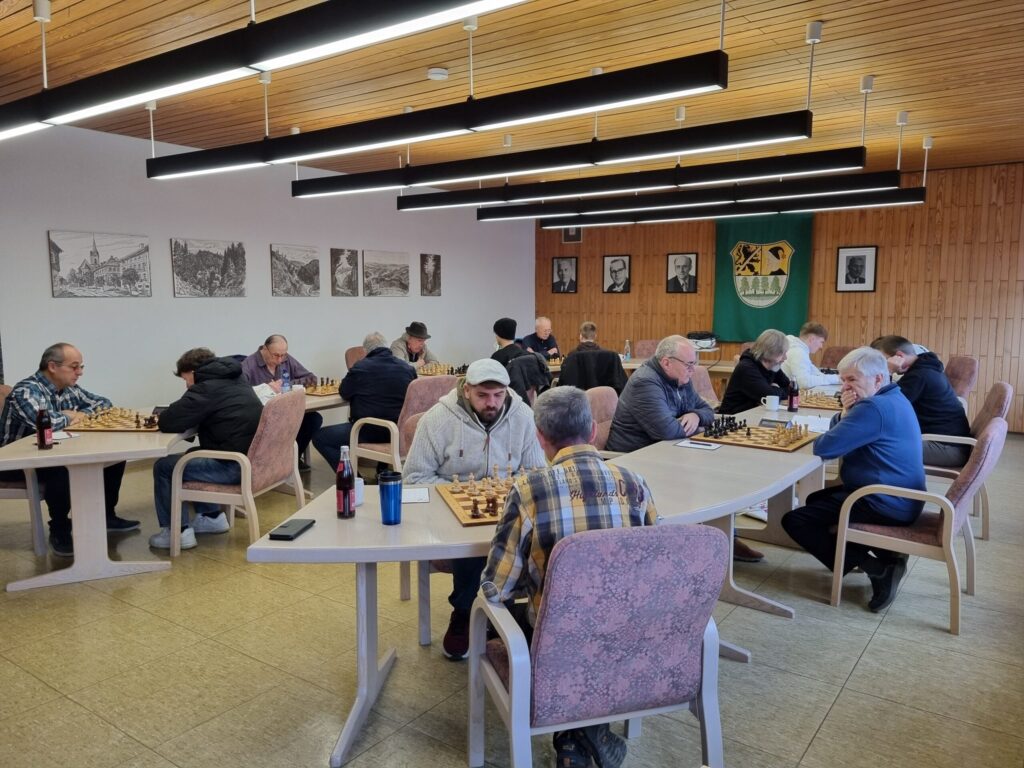 In der Bezirksliga West meldeten sich alte Bekannte an der Spitze zurück, die lange Jahre zum Inventar der Bezirksoberliga gehörten: Der FC Nordhalben bezwang den SSV Burgkunstadt im Sitzungssaal des Rathauses. Davon stammt auch unser Bild, auf dem bei genauerem Betrachten vier „Zuschauer“ zu sehen sind – die Altbürgermeister der Marktgemeinde Nordhalben. (Foto: Stefanie Kübrich) Ganz vorne bleibt Michelau nach einem 4:4 gegen die stark kämpfenden Tettauer. Einen Punkt dahinter sage und schreibe fünf Jäger, nur durch die Brettpunktbilanz getrennt. Leider kam es – durch SC Bamberg 4 – zur ersten Spielabsage der Saison; diese spülte Fast-Absteiger Neustadt 2 bis auf Platz zwei nach oben. Der nächste Gegner der Neustadter ist Hollfeld/Memmelsdorf 2, für die es bisher nichts zu holen gab.