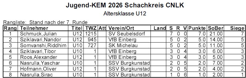In der Klasse “ unter 12 Jahren “ siegte souverän der Favorit Julian Schmuck vom SV Seubelsdorf mit 7 : 0 Punkten. Auf den 2 . Platz kam Nandor Sziklavari vom VfB Einberg mit 5 Punkten vor Riddhim Somvanshi vom SK Michelau, der ebenfalls 5 : 2 Punkte erreichte, aber die schlechtere Wertung hatte. Die Burgkunstadter Nachwuchsspieler Nashar Nasrulla, Oliver Hofmann und Sirac Nasrulla belegten die Plätze 6 -8.