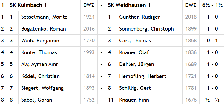Unser Spiel des Tages: Macht der SK Kulmbach sein Meisterstück, oder gelingt dem SK Weidhausen ein letzter Kraftakt im Abstiegskrimi? Die Rollen waren klar verteilt. Doch Weidhausen ging 1:0 in Führung und suchte danach immer wieder seine Chance, legte großen Kampfgeist an den Tag. Kulmbach lief zur Meisterform auf und ließ sich den langersehnten Titel nicht mehr nehmen. Nach mehr als vier Stunden stand der 6,5:1,5-Sieg fest, die Gäste waren absolut faire Verlierer. Unser Bild (danke an Thomas Kunte!) zeigt die Meistermannschaft, die auch im letzten Spiel in Bestbesetzung antrat – was sicher ein Geheimnis des Erfolgs ist. In der Regionalliga Nord-West wollen die Kulmbacher nun an glorreiche Zeiten ihrer Vereinsgeschichte anknüpfen. Herzlichen Glückwunsch zum Aufstieg! Und auch für Weidhausen gab es ein Happy End: Da alle drei Konkurrenten im Bezirksoberliga-Keller ihre Wettkämpfe verloren, verbleiben Günther & Co. erneut nach einem Herzschlagfinale im Oberhaus.